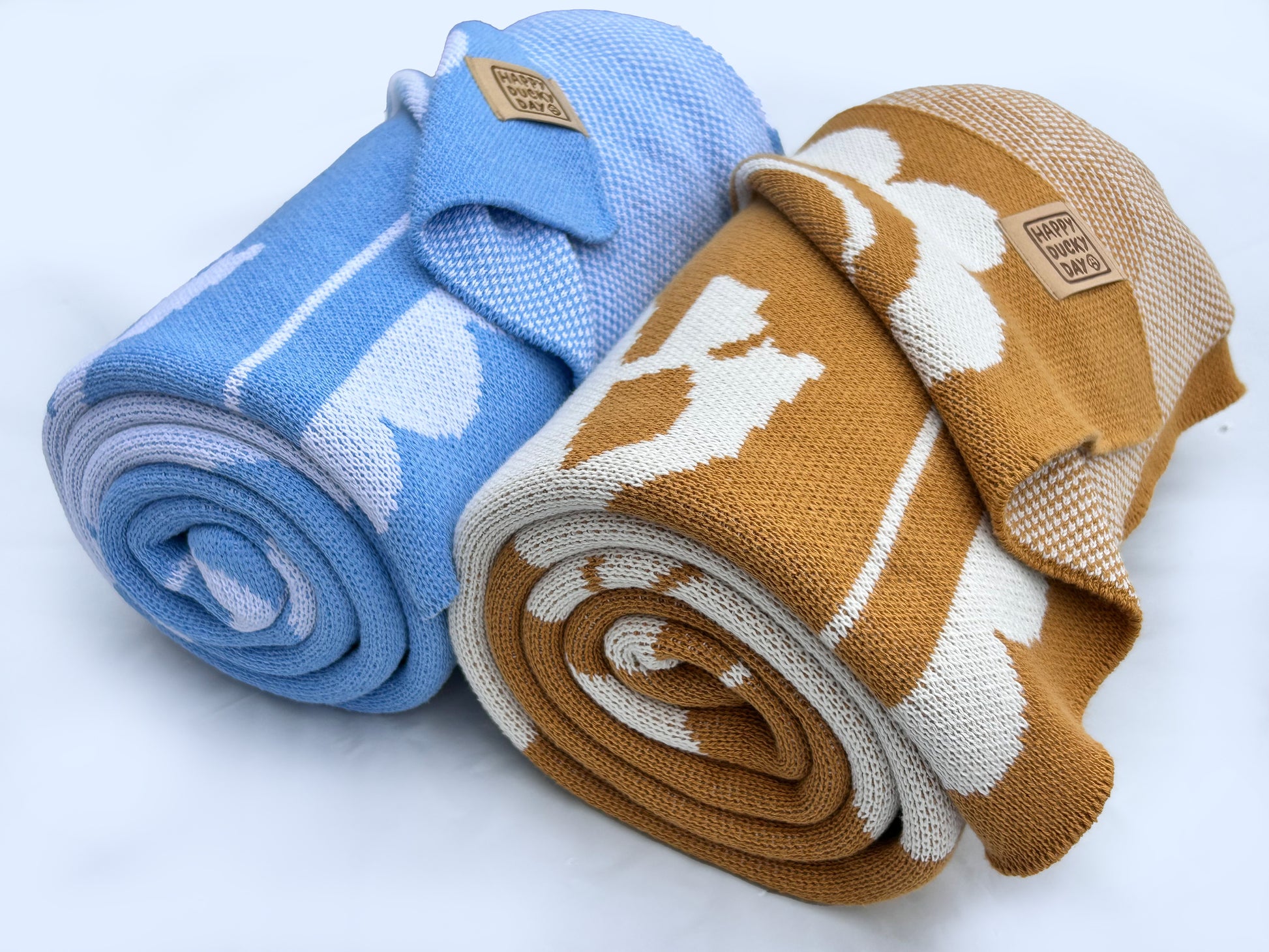 These are wonderful, cozy cotton blankets featuring my original design and exceptional machine-knitted quality, crafted by professionals. I collaborate with a New York-based company that ensures fast and top-tier production.